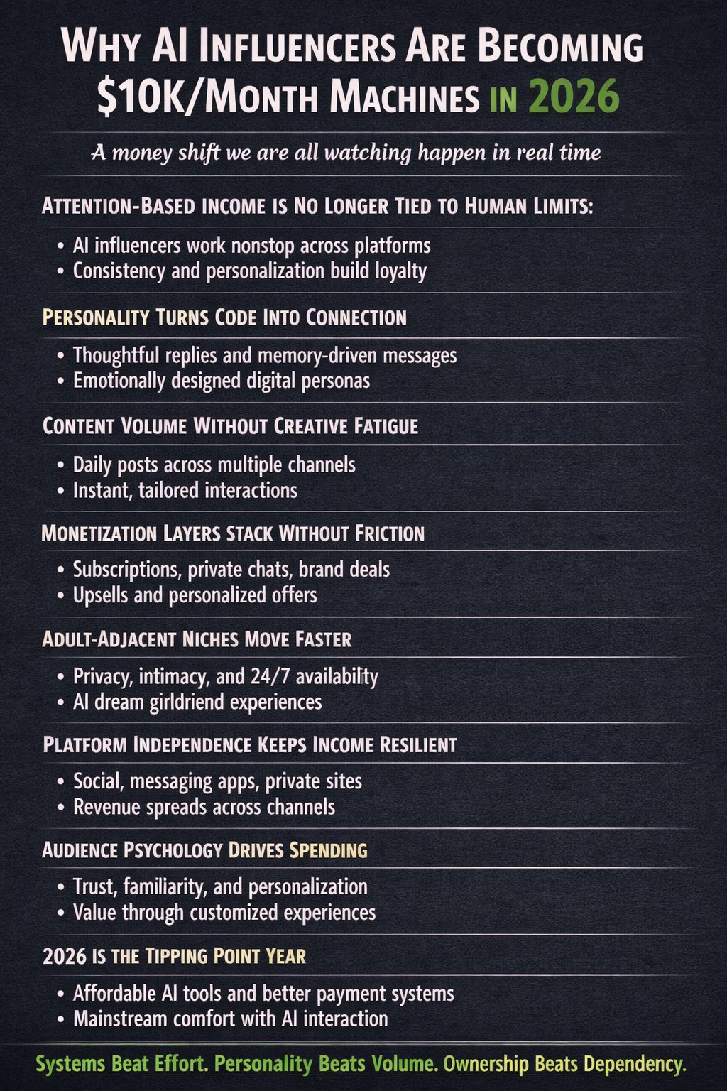 They work because attention economics have changed. They work because people want connection, uniqueness, and consistency. They work because creators want control and scale. An AI influencer fits perfectly into this gap. They do not get tired. They operate across platforms. They adjust tone, content, and pacing based on audience behavior. Obviously, this is why so many are crossing $10,000 per month in 2026.